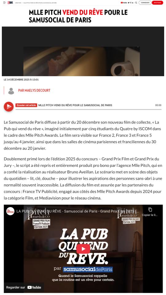 Le nouveau film de collecte du Samusocial de Paris « La Pub qui vend du rêve » sera diffusé sur les chaînes de France TV (France 2, France 3, et France 5) du 20 décembre au 4 janvier. Le film sera également diffusé dans les cinémas de Paris et d’Île-de-France du 30 décembre au 20 janvier. Le script a été imaginé par des 5 étudiants du Quatre by ISCOM et doublement primé aux derniers Mlle Pitch Awards. Il a ensuite été intégralement produit par l’agence Mlle Pitch qui en a confié la réalisation à Bruno Aveillan.