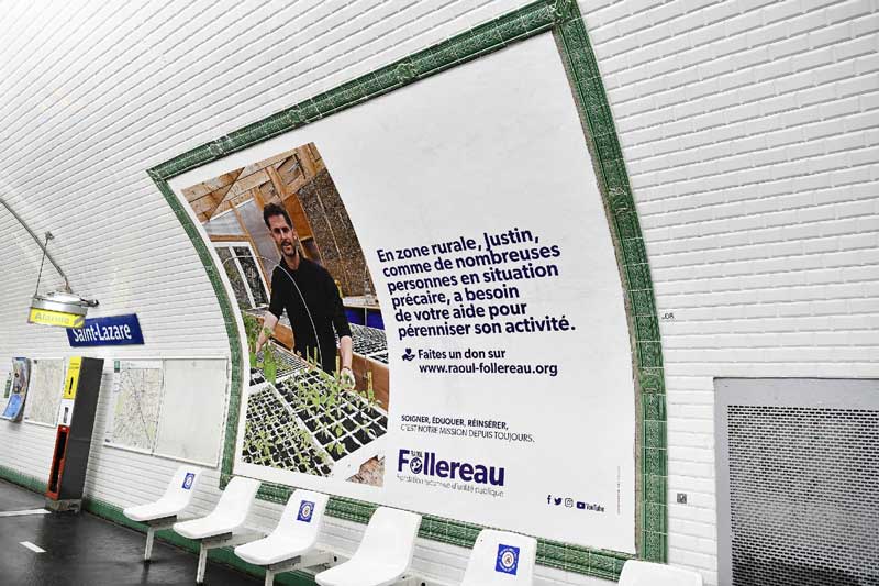 L’agence profite de la sortie du confinement pour déployer une campagne low-cost en affichage métro pour mettre en avant la problématique d’accès à l’emploi des personnes en situation de précarité en milieu rural et valoriser son rôle d’acteur majeur pour l’aide aux producteurs et aux entrepreneurs ruraux. En effet à la sortie de la crise du Covid-19, les associations ont témoigné d’une augmentation de l’intérêt des français concernant leur engagement et leurs dons pour les causes solidaires et il semblait opportun pour l’agence de profiter de cet élan pour mettre en lumière les actions de la Fondation en zone rurale. L’agence Mlle Pitch imagine donc en 8 jours une campagne mettant en avant les entrepreneurs directement soutenus par la Fondation, incarnée par Justin maraîcher bio installé en Occitanie reprenant la signature générique de la Fondation « Soigner, éduquer, réinsérer, c’est notre mission depuis toujours. ».