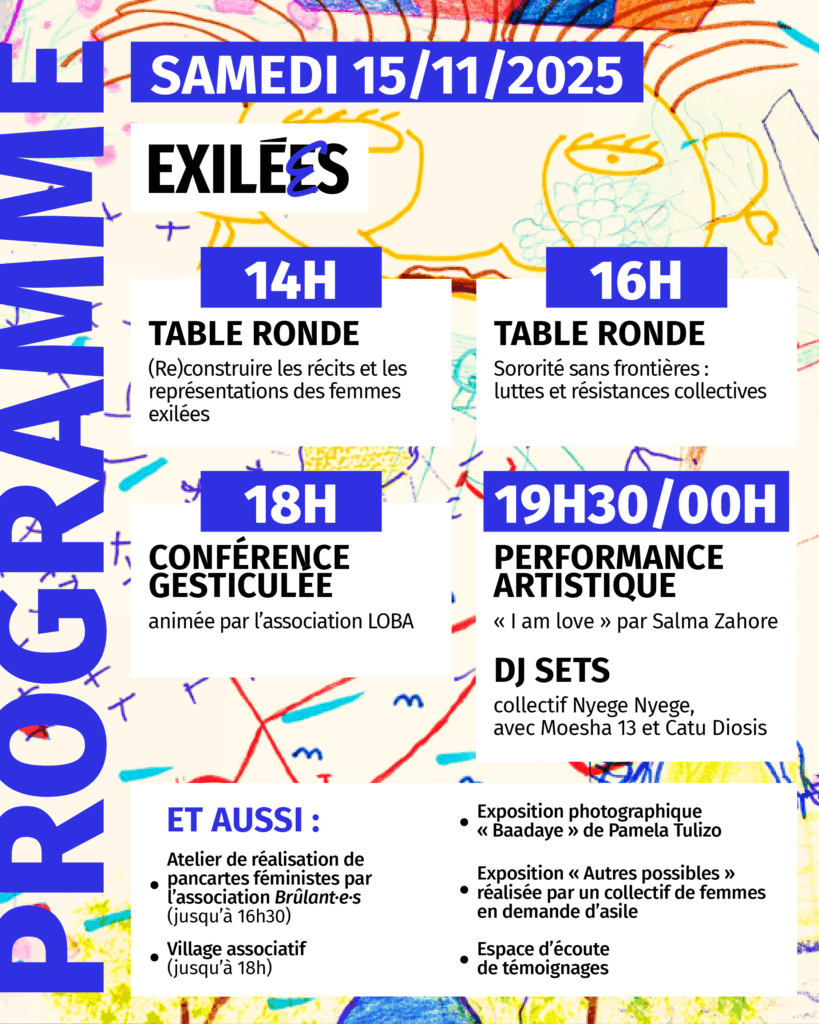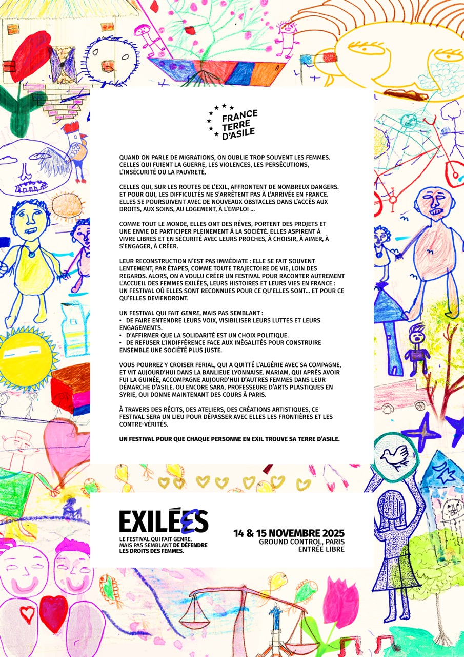 « Exi­lées : le fes­ti­val qui fait genre, mais pas sem­blant », orga­ni­sé par France terre d’asile les 14 et 15 novembre à Ground Control (Paris 12ᵉ), est un évé­ne­ment à la croi­sée du plai­doyer et de la sen­si­bi­li­sa­tion du grand public, dédié à la visi­bi­li­sa­tion, la valo­ri­sa­tion et la mobi­li­sa­tion autour des droits des femmes exilées.