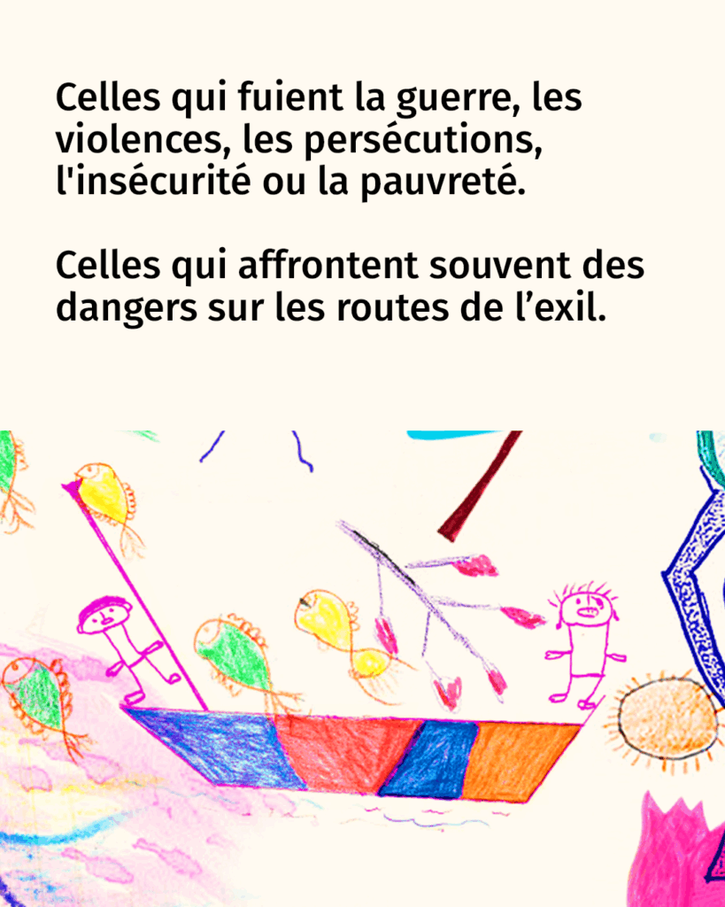 Aujourd’­hui, les femmes repré­sentent 52% des per­sonnes migrantes en France. Celles-ci ont 18x plus de risques de subir un viol, et d’ailleurs 9 femmes sur 10 ont déjà subi des vio­lences sur le che­min de l’exil. Les femmes ont long­temps été invisibilisées au sein des migra­tions inter­na­tio­nales alors qu’elles représentent envi­ron la moi­tié des per­sonnes migrantes. Beau­coup d’entre elles sont poussées à quit­ter leur pays en rai­son de persécutions ou de mau­vais trai­te­ments fondés sur leur genre, et elles subissent sou­vent des vio­lences sexistes et sexuelles durant leur par­cours migra­toire, ain­si que dans les pays dans les­quels elles arrivent.