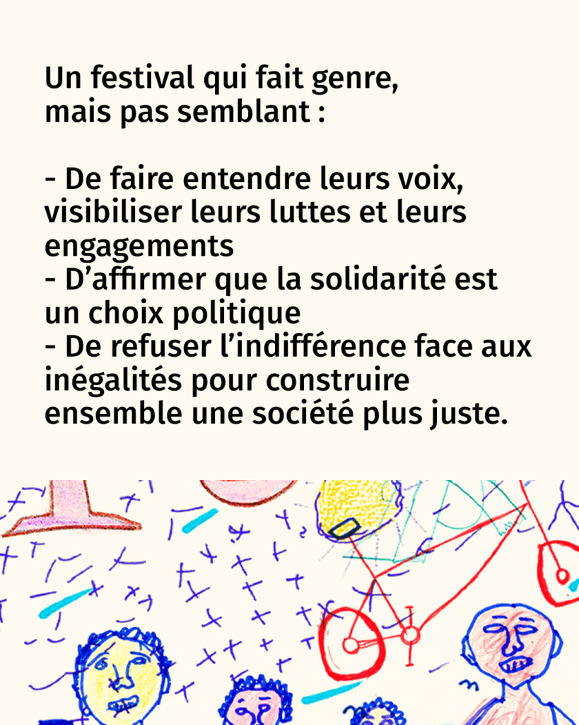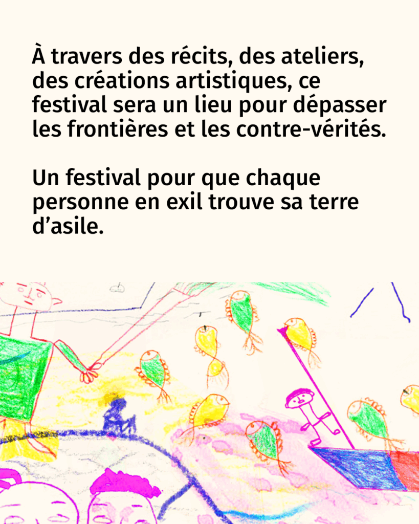 Mlle Pitch a réa­li­sé de A à Z toute l’i­den­ti­té gra­phique du fes­ti­val : nom, logo, affiche et mani­feste. L’affiche du fes­ti­val a été réa­li­sé en par­tie par des femmes exi­lées accom­pa­gnées par France terre d’asile lors d’un ate­lier de des­sin thé­ra­pie, sous la direc­tion artis­tique de l’agence. Les par­ti­ci­pantes ont été invi­tée à créer un des­sin, un mot, une forme ou un geste colo­ré, qui raconte un mor­ceau de leur his­toire, une émo­tion ou un sou­ve­nir de leur par­cours. Les des­sins se sont prin­ci­pa­le­ment concen­trés autour de 4 thé­ma­tiques : Le transport/le voyage, les pay­sages tra­ver­sés, les objets qui les ont accom­pa­gnés et les émo­tions vécues. Les des­sins ont ensuite été inté­grés dans le visuel du festival.