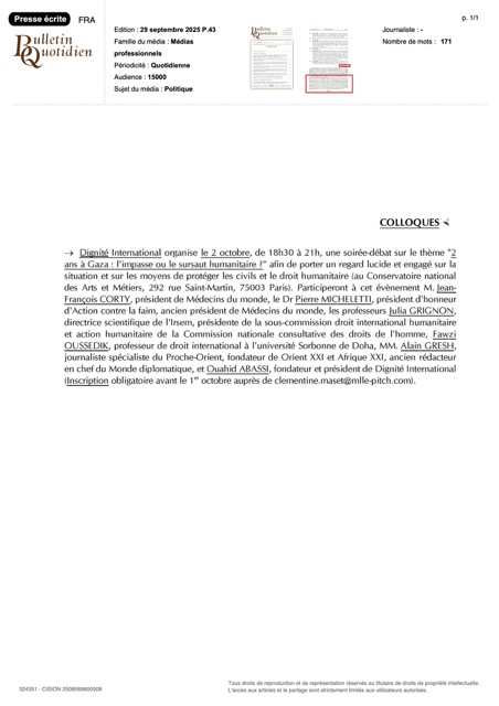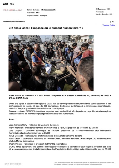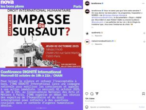 En parallèle de la campagne, Dignité International a organisé un colloque le 2 octobre au musée des Arts et Métiers de Paris baptisé « 2 ans à Gaza – l’impasse ou le sursaut humanitaire ? »
