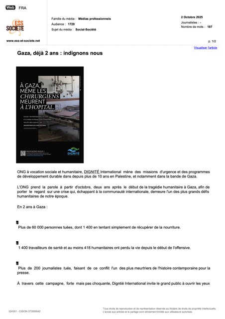 DIGNITÉ International a lancé une pétition qui appelle les citoyens à se mobiliser pour exiger la protection des civils et la reconnaissance des droits fondamentaux des Palestiniens. Cette pétition qui a recueilli plus de 60 00à signature au 7 octobre 2025 sera remise au Sénat, afin que cette exigence soit entendue au plus haut niveau.