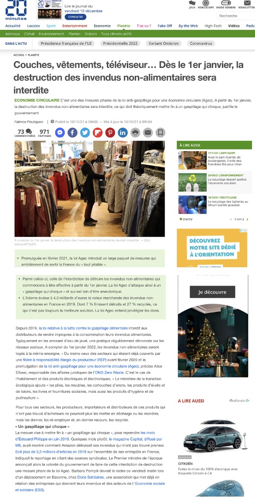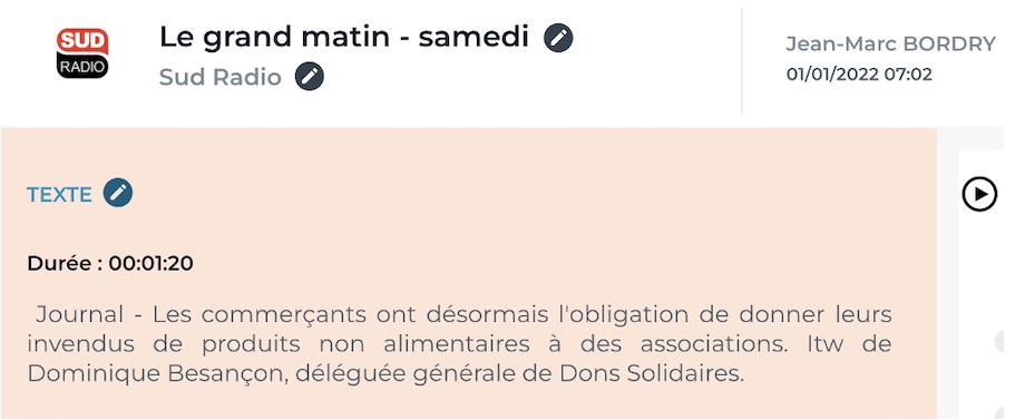 Dans un second temps Mlle Pitch sollicite son pôle RP pour activer l’intérêt des médias d’actualité en pleine période de vacances de noël et reprise du variant OMICRON à dédier un reportage de fonds sur Dons solidaire principal collecteur d’invendus non alimentaires en France pour illustrer leur reportage dans le cadre de l’adoption de la loi AGEC.