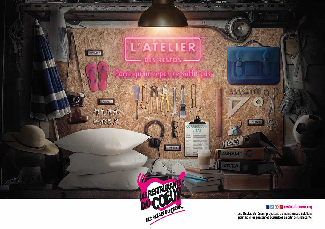Je souhaitais « mettre en lumière » sur les coulisses des Restos du Cœur, montrer « l’envers du décor ». Représenter visuellement un atelier de bricolage me semblait être adéquat pour illustrer l’univers des services proposés par l’association. Certains services étant méconnus du public, j’ai pensé que m’inspirer d’un visuel évocateur pour tous, permettrait de capter l’intérêt et la compréhension du plus grand nombre. Et puis osons le dire, chaque bénévole est, en quelque sorte, un artisan du cœur. L’artisan du cœur qui, grâce à ses outils, « répare » et « reconstruit » les personnes dans le besoin.