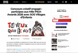 La 6ème édition du concours Mlle Pitch Awards & Co, organisée par l’agence engagée Mlle Pitch, est lancée ! L’édition 2026 met à l’honneur SOS Villages d’Enfants, une fondation qui agit depuis près de 70 ans pour protéger les enfants privés de protection parentale et leur permettre de grandir avec leurs frères et sœurs.