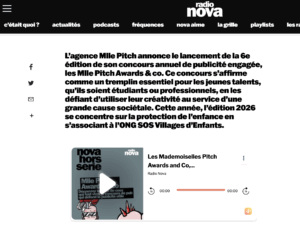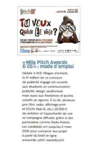 L’agence Mlle Pitch annonce le lancement de la 6e édition de son concours annuel de publicité engagée, les Mlle Pitch Awards & co. Ce concours s’affirme comme un tremplin essentiel pour les jeunes talents, qu’ils soient étudiants ou professionnels, en les défiant d’utiliser leur créativité au service d’une grande cause sociétale. Cette année, l’édition 2026 se concentre sur la protection de l’enfance en s’associant à l’ONG SOS Villages d’Enfants.