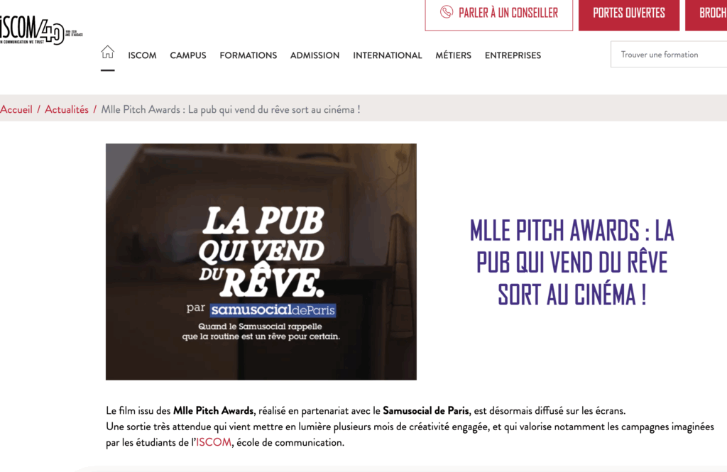 Le Samusocial de Paris diffuse à partir du 20 décembre son nouveau film de collecte, « La Pub qui vend du rêve », imaginé initialement par cinq étudiants du Quatre by ISCOM dans le cadre des Mlle Pitch Awards. Le film sera visible sur France 2, France 3 et France 5 jusqu’au 4 janvier, ainsi que dans les salles de cinéma parisiennes et franciliennes du 30 décembre au 20 janvier.