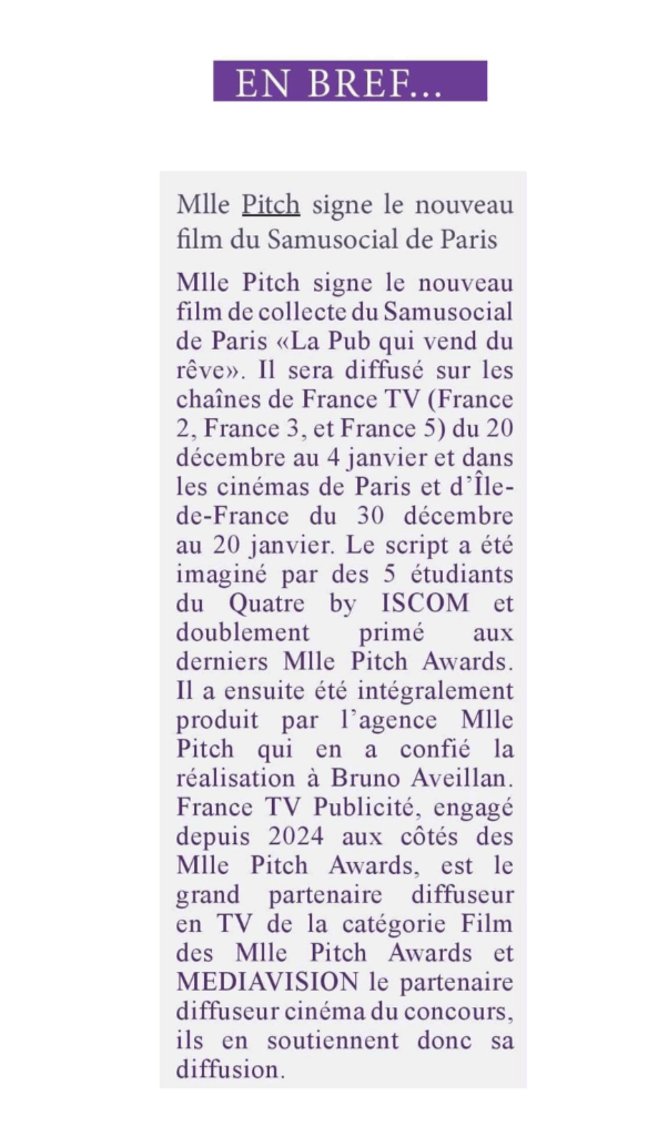 Mlle Pitch signe le nouveau film de collecte du Samusocial de Paris « La Pub qui vend du rêve ». Il sera diffusé sur les chaînes de France TV (France 2, France 3, et France 5) du 20 décembre au 4 janvier et dans les cinémas de Paris et d’île de-France du 30 décembre au 20 janvier.